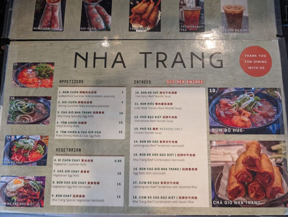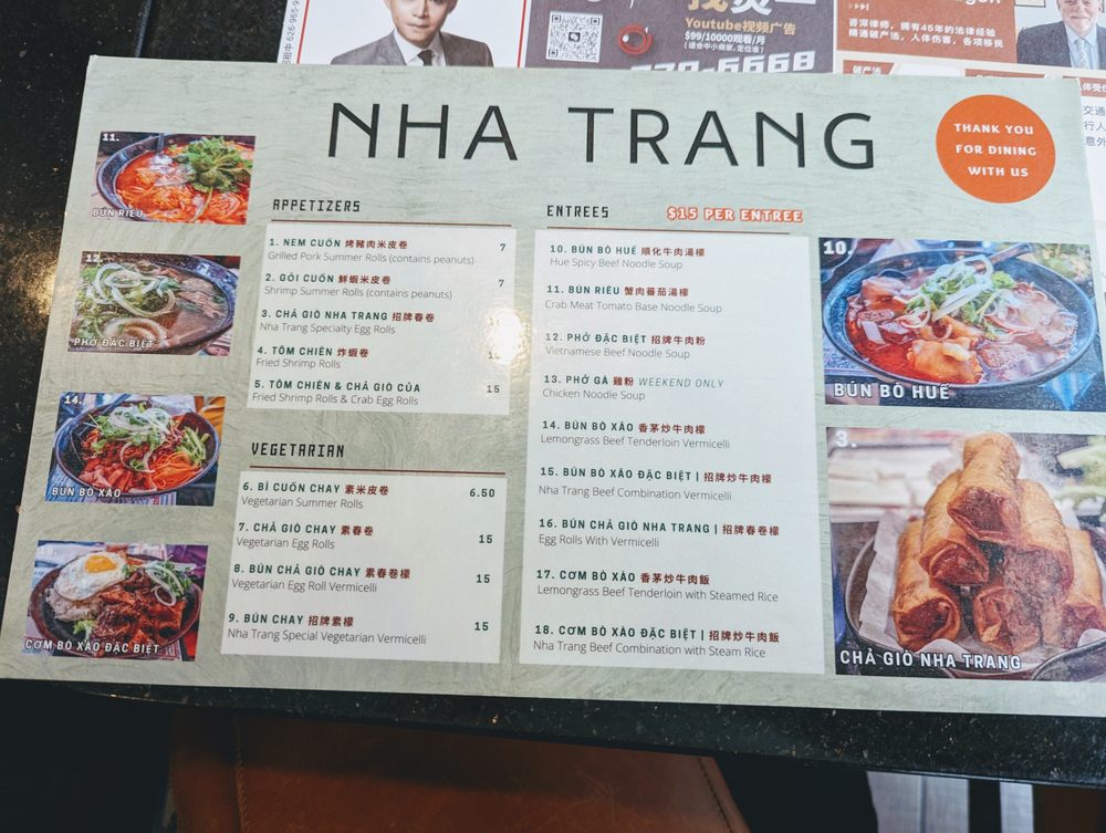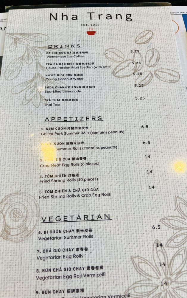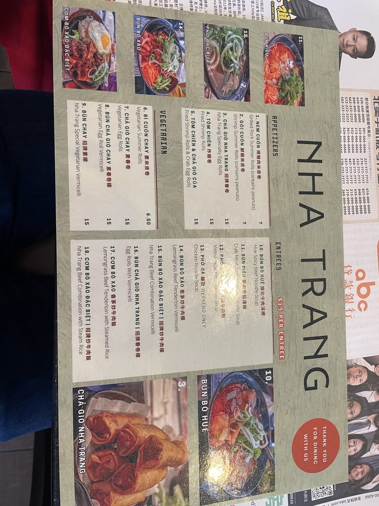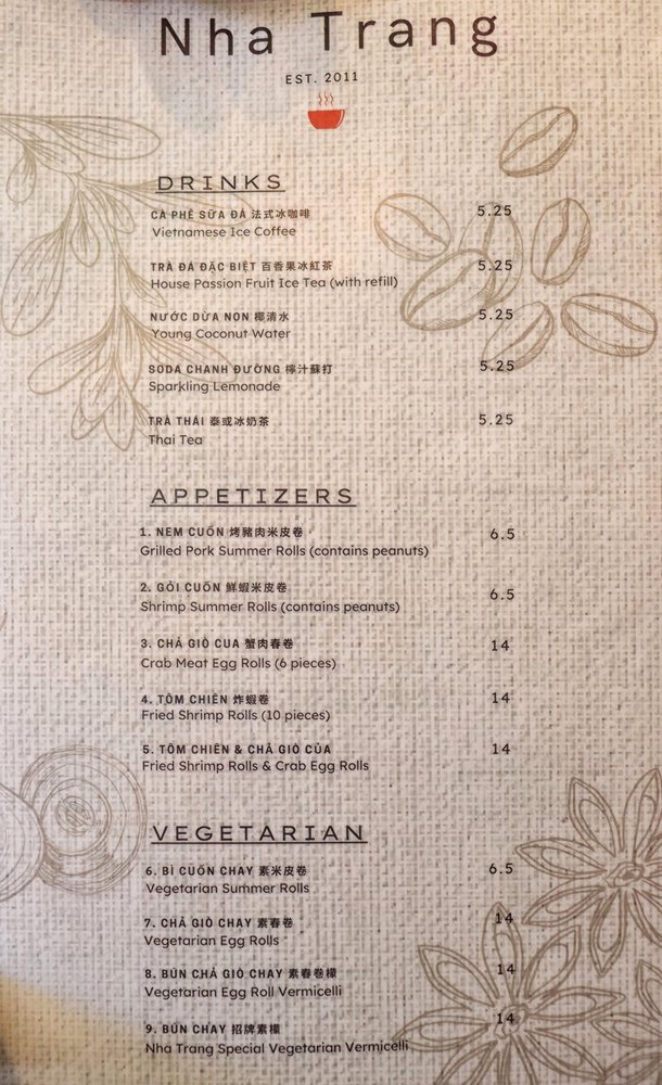 Introducing the menu at Nha Trang, a Vietnamese Cuisine gem in Monterey Park, CA. This casual spot offers a variety of appetizers like Nem Cuon, Goi Cuon, and Cha Gio Cua. For vegetarians, try the Bi Cuon Chay or the Bun Chay for a flavorful experience. Entrees range from traditional Bun Bo Hue to Pho Ga on weekends. Customers rave about the fresh ingredients, delicious flavors, and excellent service. The limited menu ensures each dish is carefully crafted and bursting with authentic Vietnamese taste. Don't miss out on trying their specialty noodle soups and refreshing passion fruit tea. Nha Trang is a must-visit for a satisfying lunch or dinner experience that will transport you to the streets of Vietnam.