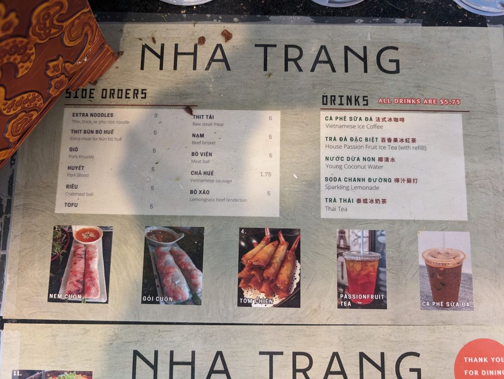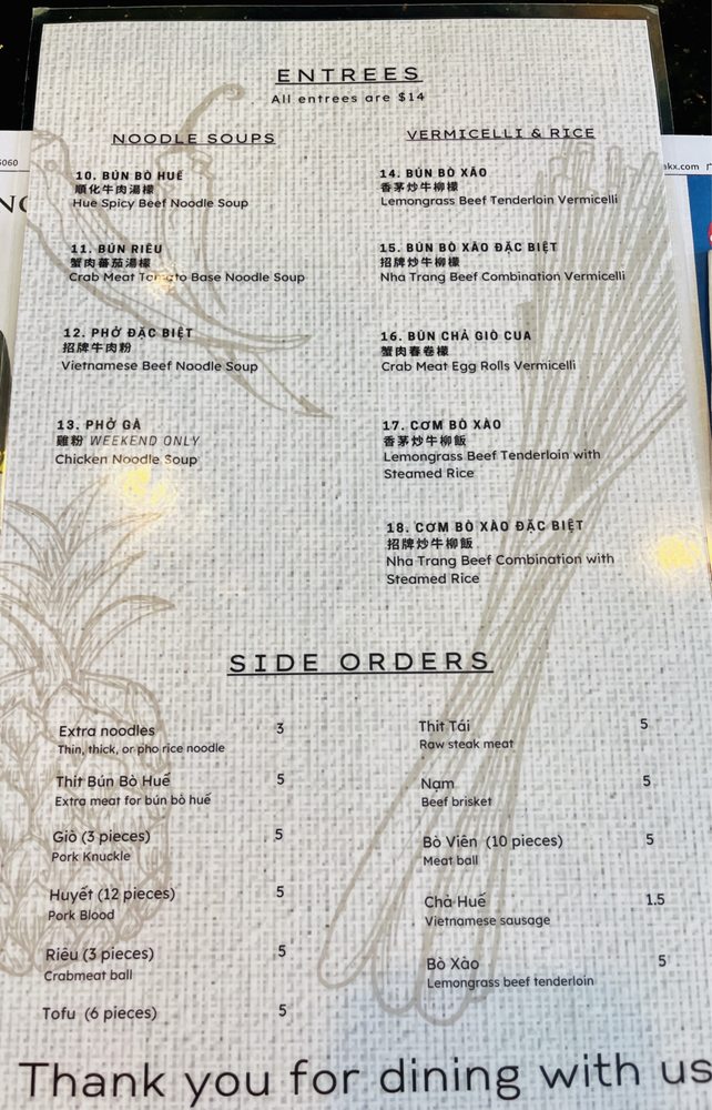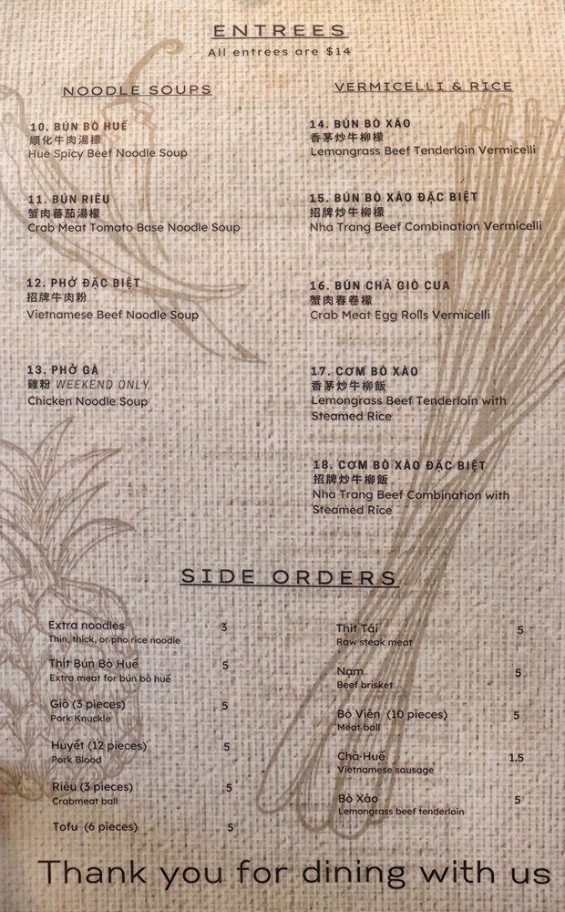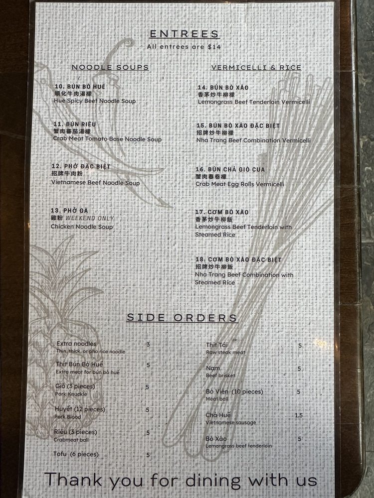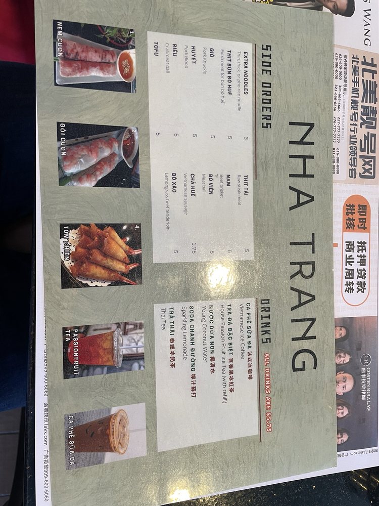 Introducing the menu at Nha Trang, a Vietnamese Cuisine gem in Monterey Park, CA. This casual spot offers a variety of appetizers like Nem Cuon, Goi Cuon, and Cha Gio Cua. For vegetarians, try the Bi Cuon Chay or the Bun Chay for a flavorful experience. Entrees range from traditional Bun Bo Hue to Pho Ga on weekends. Customers rave about the fresh ingredients, delicious flavors, and excellent service. The limited menu ensures each dish is carefully crafted and bursting with authentic Vietnamese taste. Don't miss out on trying their specialty noodle soups and refreshing passion fruit tea. Nha Trang is a must-visit for a satisfying lunch or dinner experience that will transport you to the streets of Vietnam.